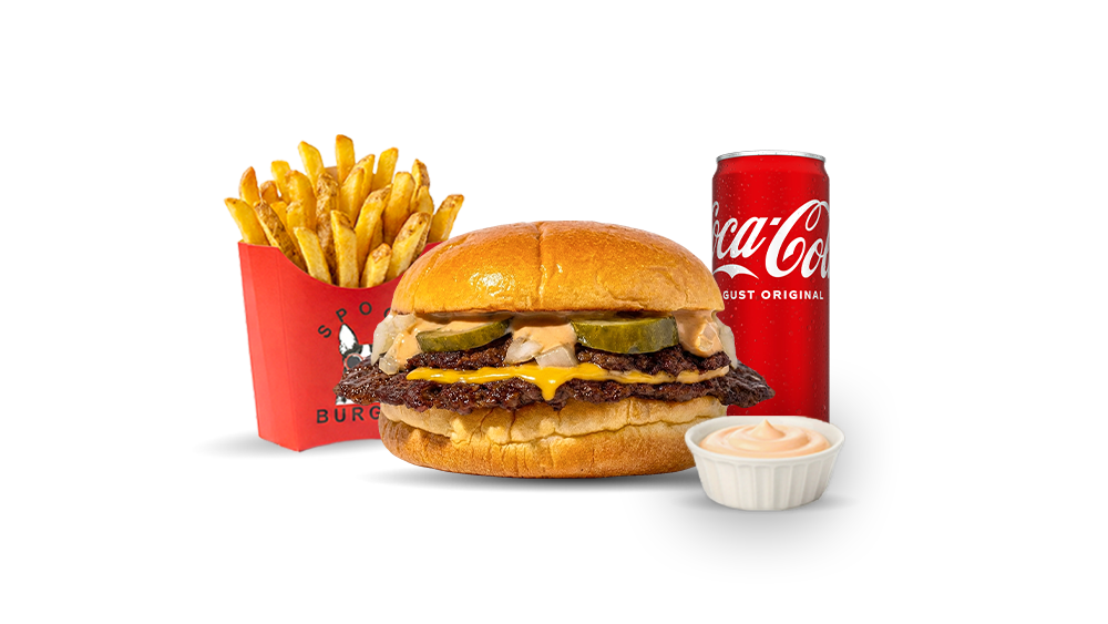 Meniu clasic cu Classic Smash burger, vită Black Angus, cheddar topit, ceapă albă și sos Spoon, alături de cartofi prăjiți, sos la alegere și băutură răcoritoare. Un meniu burger simplu, gustos și echilibrat.