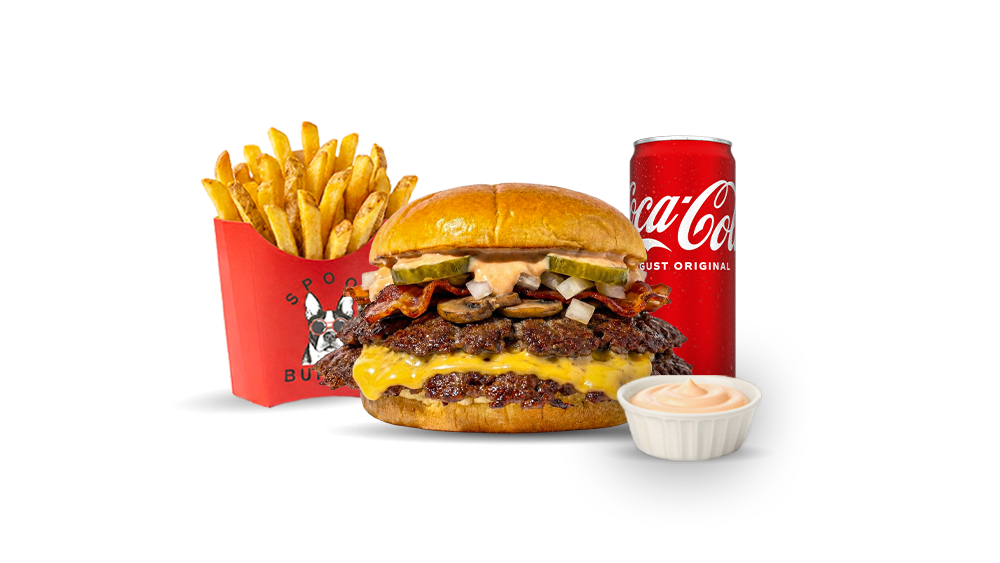 Meniu special cu Spoon Smash burger, vită Black Angus, cheddar topit, bacon crocant, ciuperci sotate și sos Spoon, completat de cartofi prăjiți, sos la alegere și suc. Meniu burger complex, ideal pentru poftă serioasă.